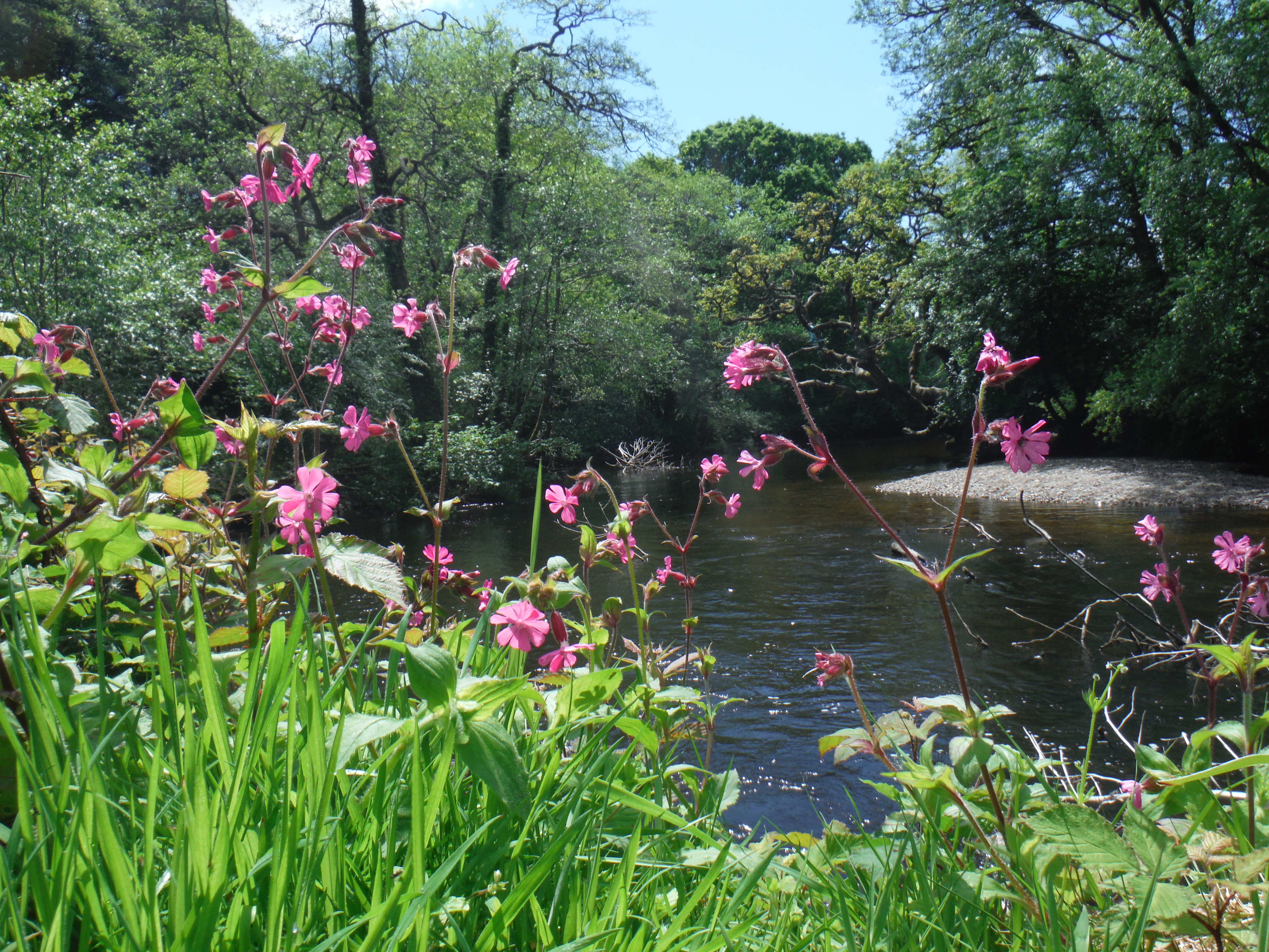 Nearby we happened upon a perfect spot for a picnic lunch, beside a right-angled bend in the river with easy access, deep water and a small beach on the wooded shore opposite. Pink campion graced the bank where a gentle slide guided me into the water. I could feel soft mud exuding through my toes as I walked in to first waist, then chest deep and I was off, drifting downstream in the gentlest of currents.